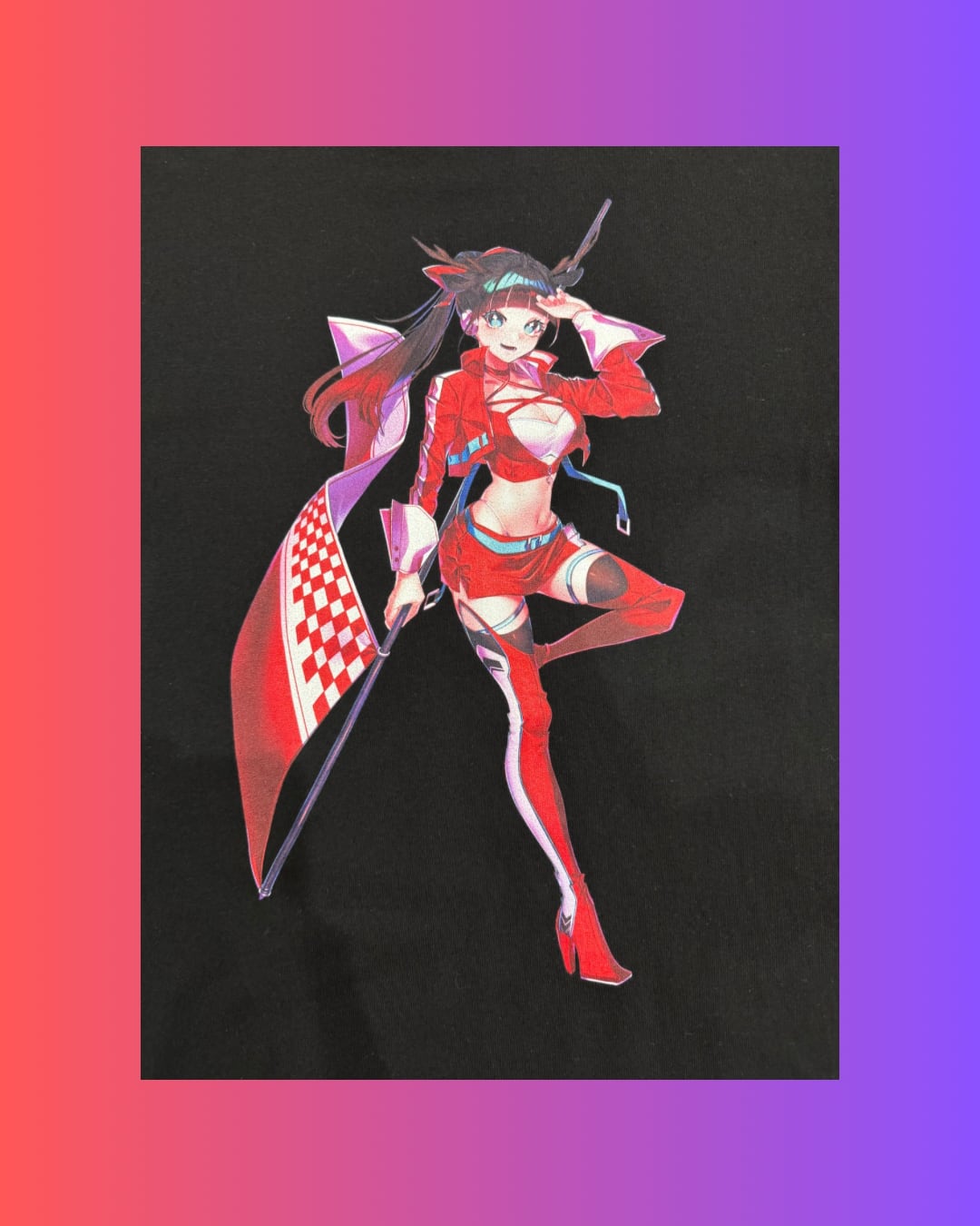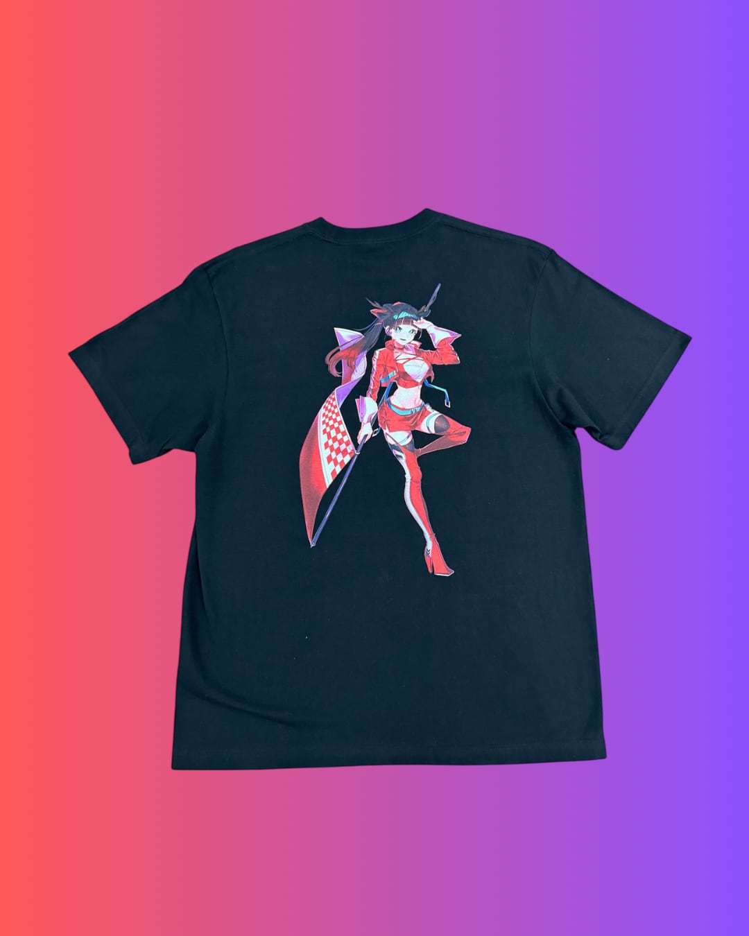 恋して!宇宙少年CAFEの架空のレーシングチーム『宇宙少年CAFEレーシング』の公式レースクイーン“巴 宇宙”(ともえ そら)を大胆にあしらったTシャツです。